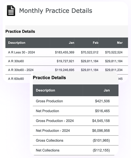 Stay on top of all your practice's monthly critical business KPIs through comparative analysis.